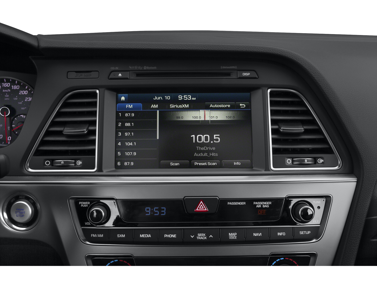 - Radio: AM/FM/SiriusXM/CD/MP3 Audio System -inc: iPod/USB and auxiliary inputs, 6 speakers (2 front-door-mounted, 2 tweeters, and 2 rear) and 5-inch color touchscreen